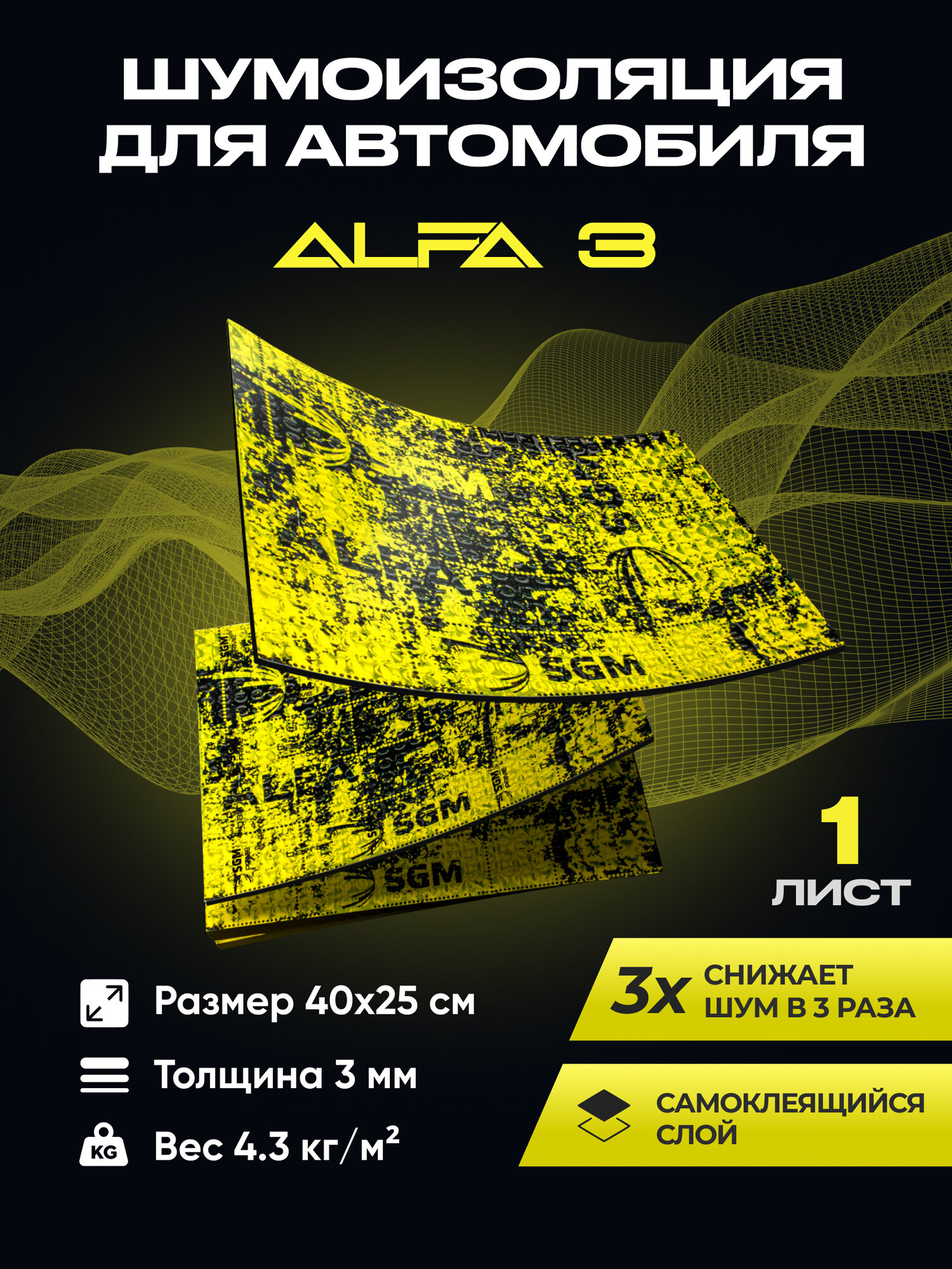 Шумоизоляция для автомобиля SGM Альфа 3, 1 лист/Виброизоляция /Комплект звукоизоляции: шумка для авто/вибродемпфер/теплоизоляция капота информация: