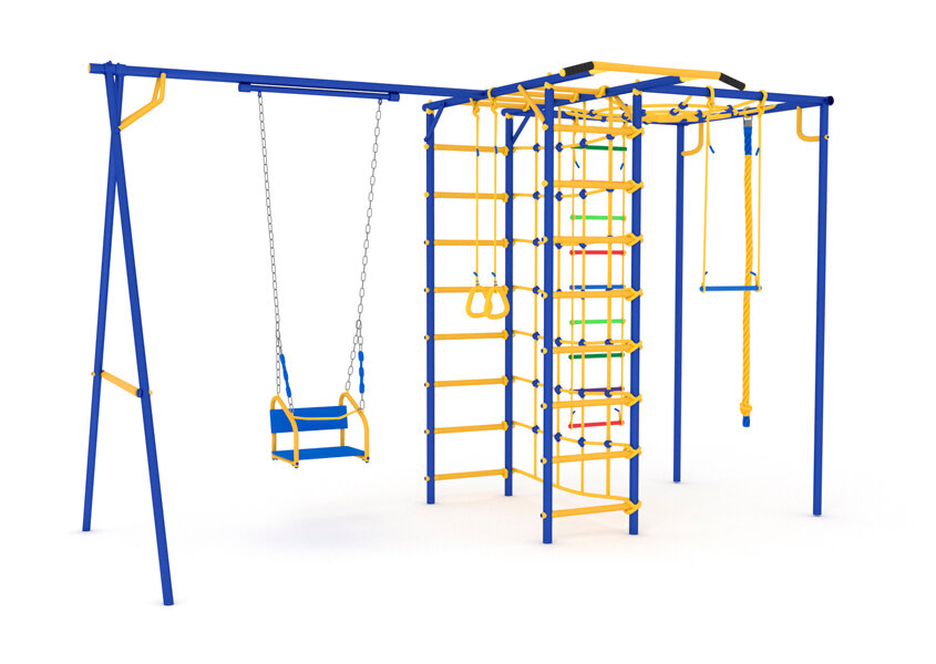 | Комплектация | Шведская стенка, Паутина, Сетка для лазания, Качели на подшипниках, Цепях, Канат, Кольца гимнастические, Турник Шведская стенка, Трапеция. |