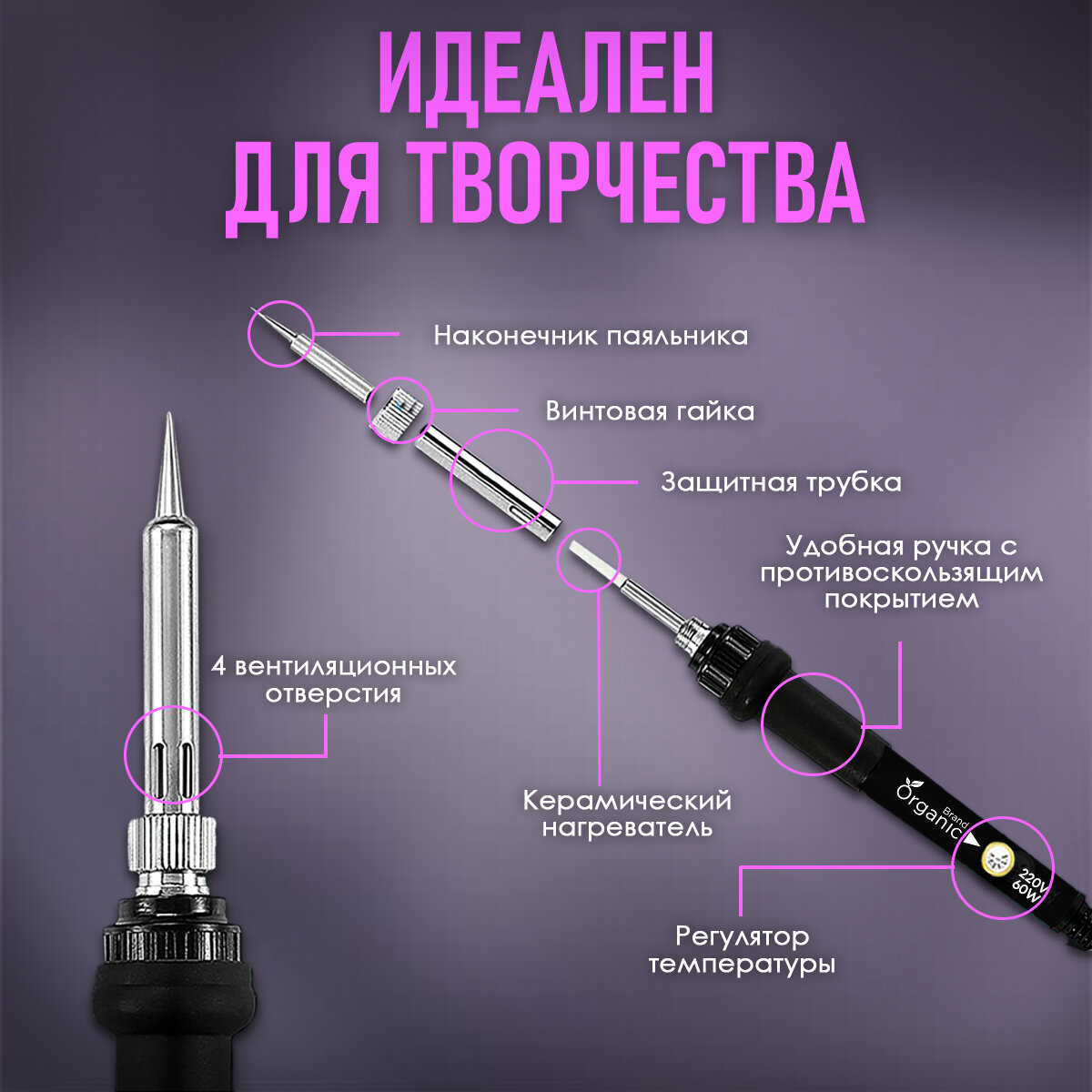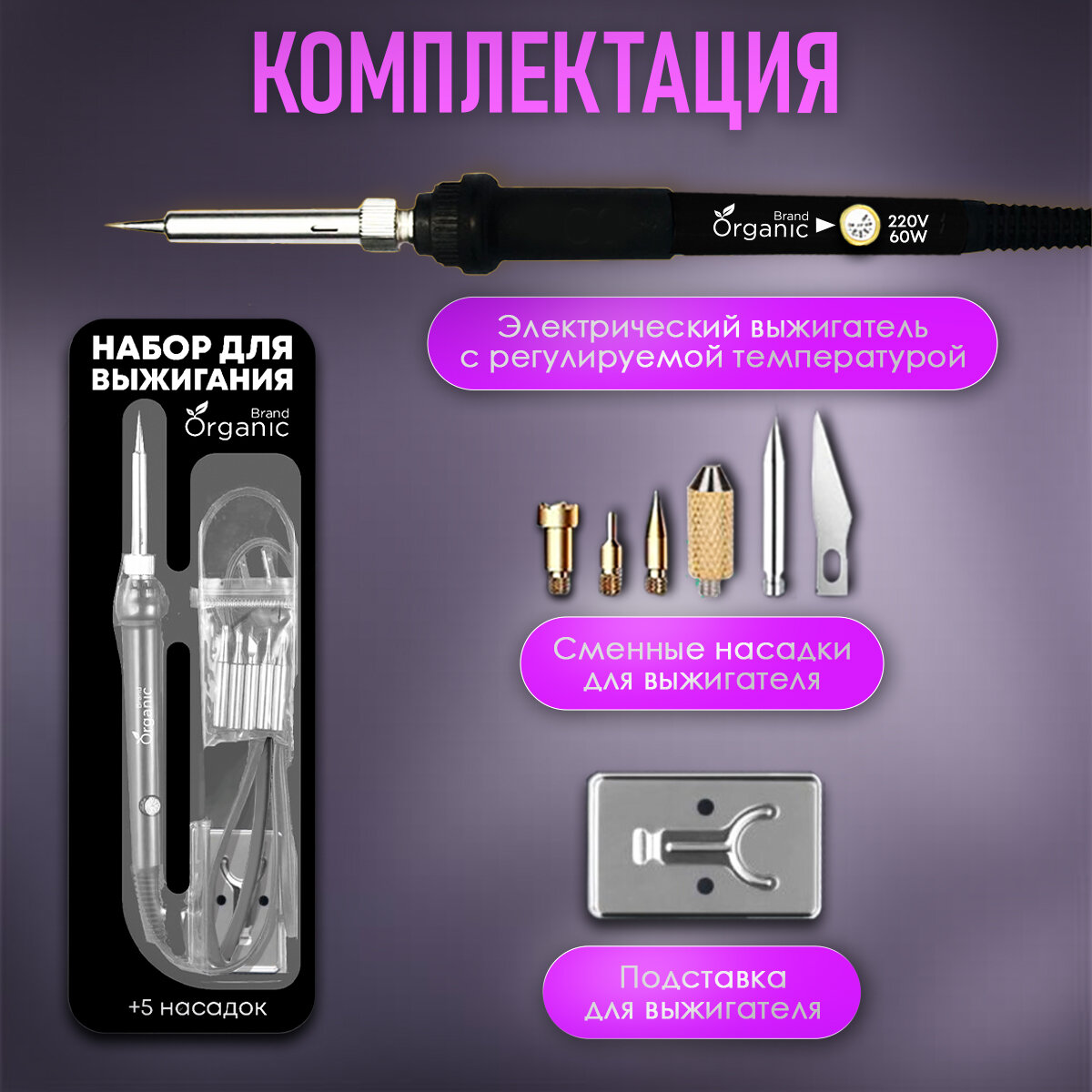 Выжигатель по дереву Organic Brand с набором насадок +нож, 60 Вт 1 350 ₽