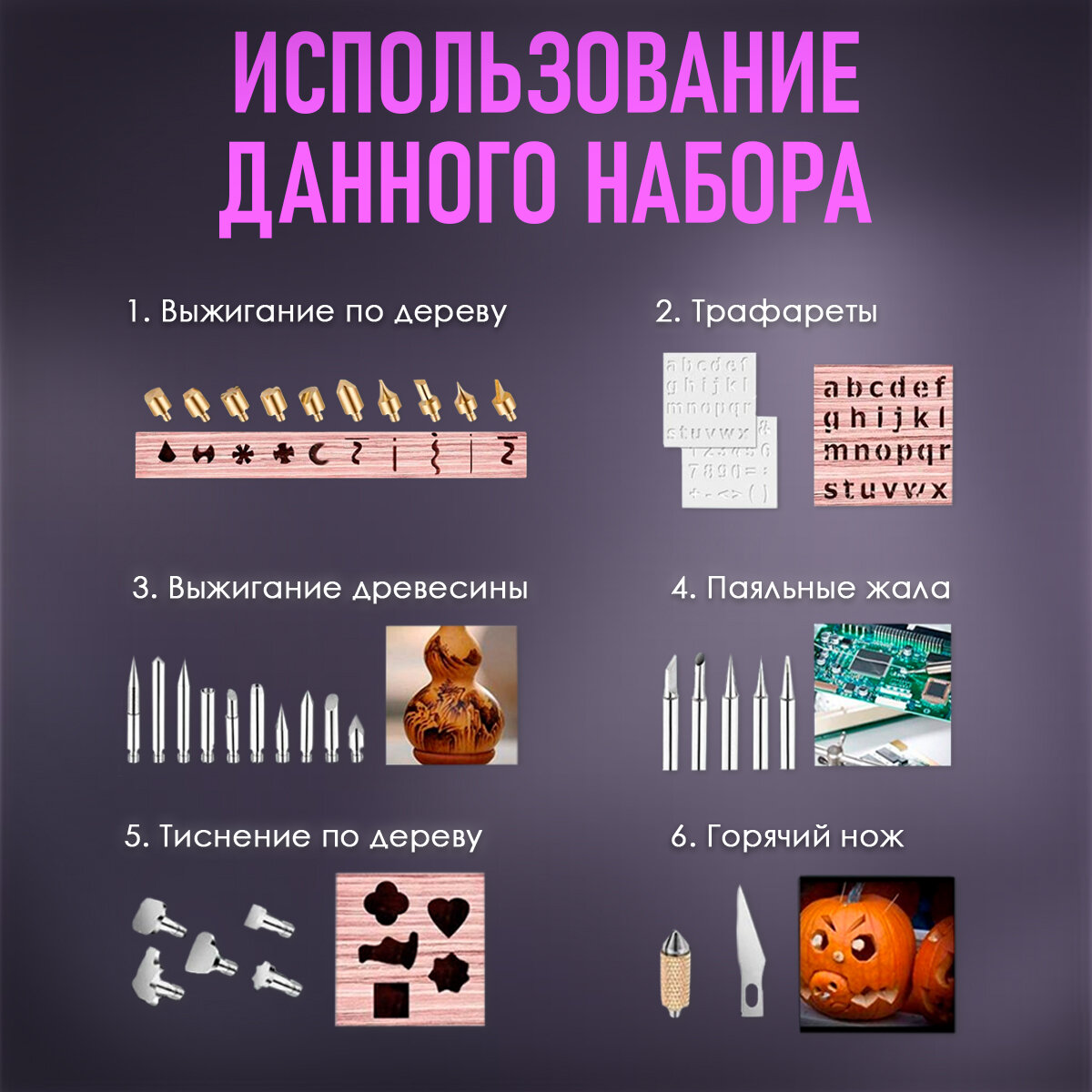 | В комплекте | выжигательный аппарат, доска для выжигания, подставка, сменные насадки, трафаретная доска |