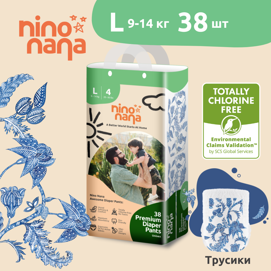 Подгузники-трусики детские Nino Nana L (9-14 кг), 4 размер. 38 штуки, расцветка Бали (Q-форма) информация: