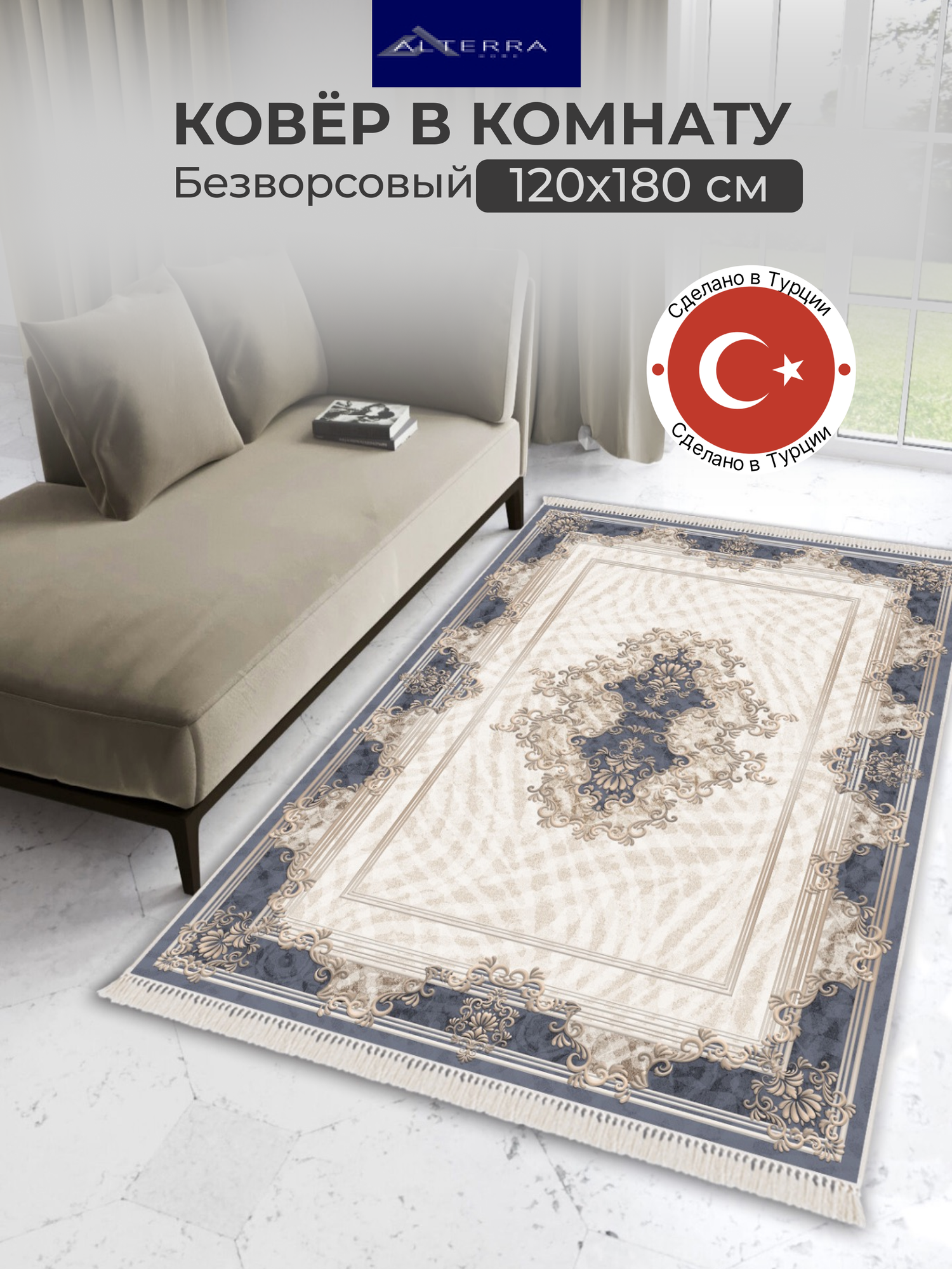 Ковер комнатный ALTERRA HOME, 120 см x 180 см, безворсовый, латексная основа, бежево-синяя гамма информация: