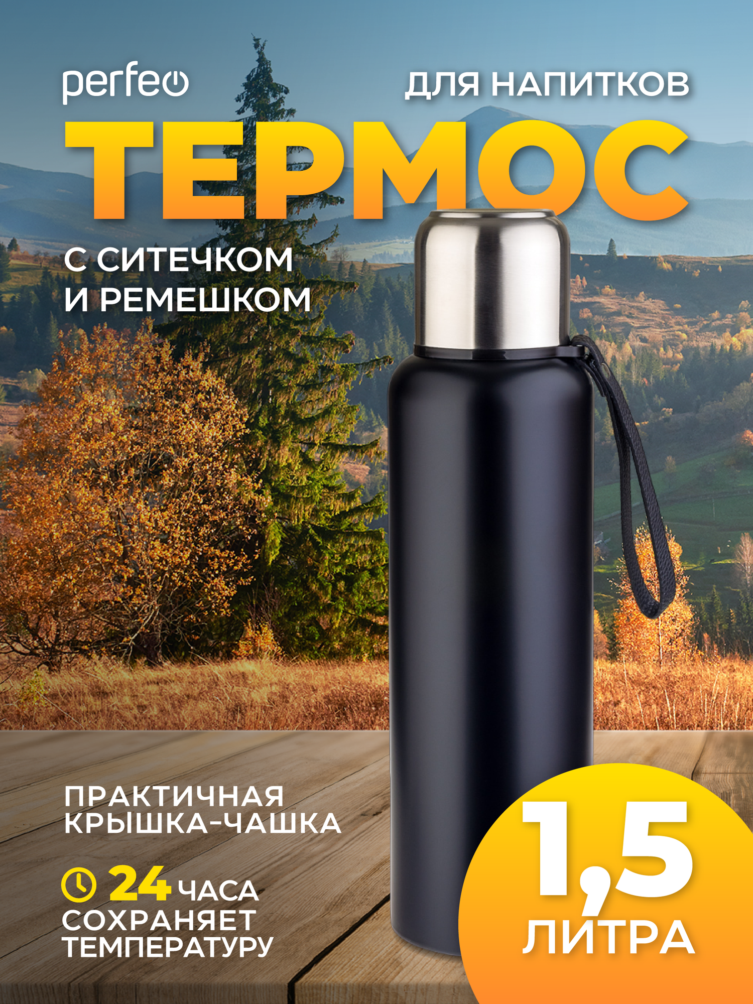 Термос PERFEO для напитков с глухой пробкой, ситечком, ремешком, объем 1,5 л, черный (PF_C3708) информация: