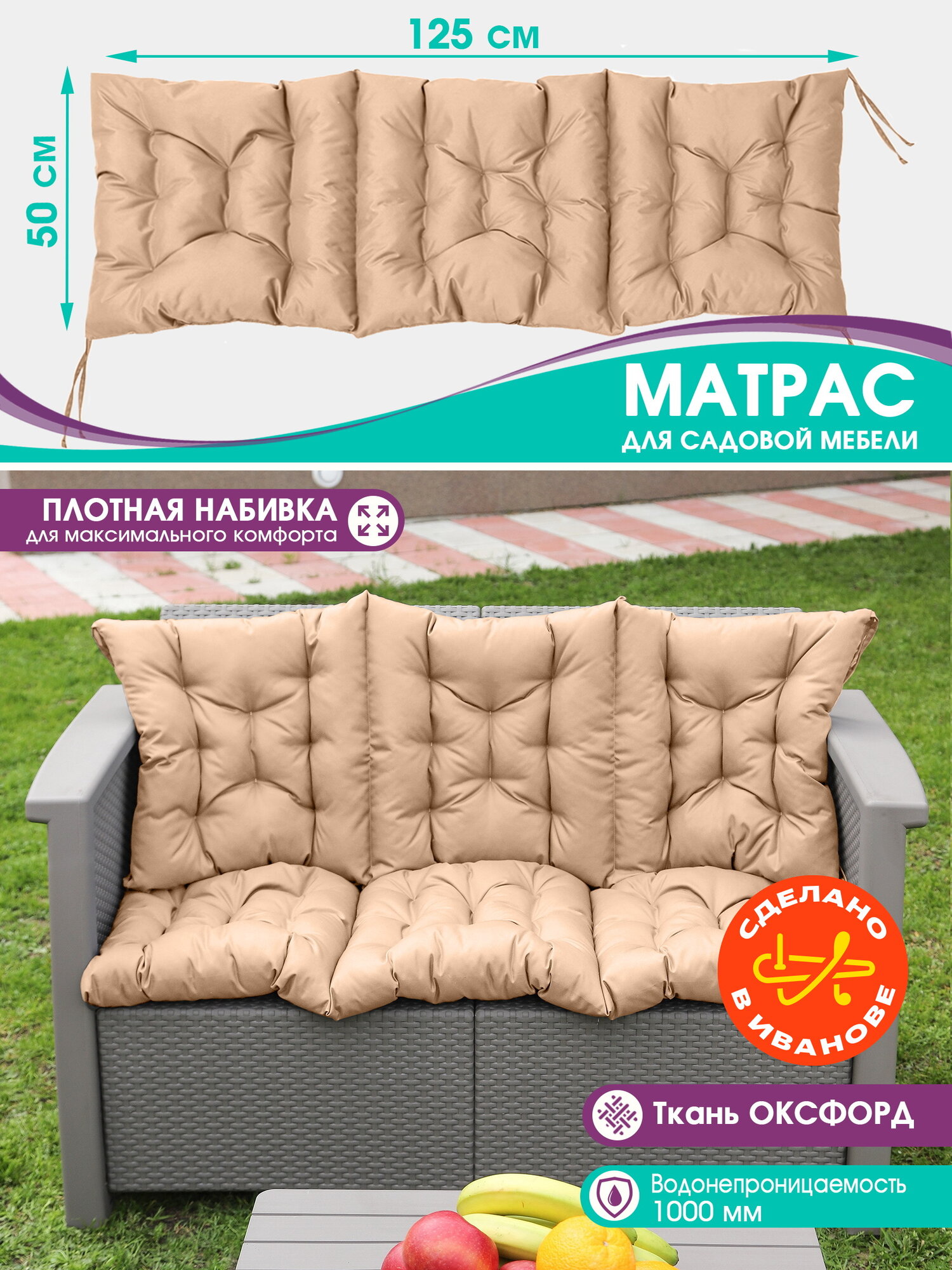Матрас для садовых качелей, подушка для подвесного кресла, на садовый диван 50х125 см, завязки, водонепроницаемый, беж информация: