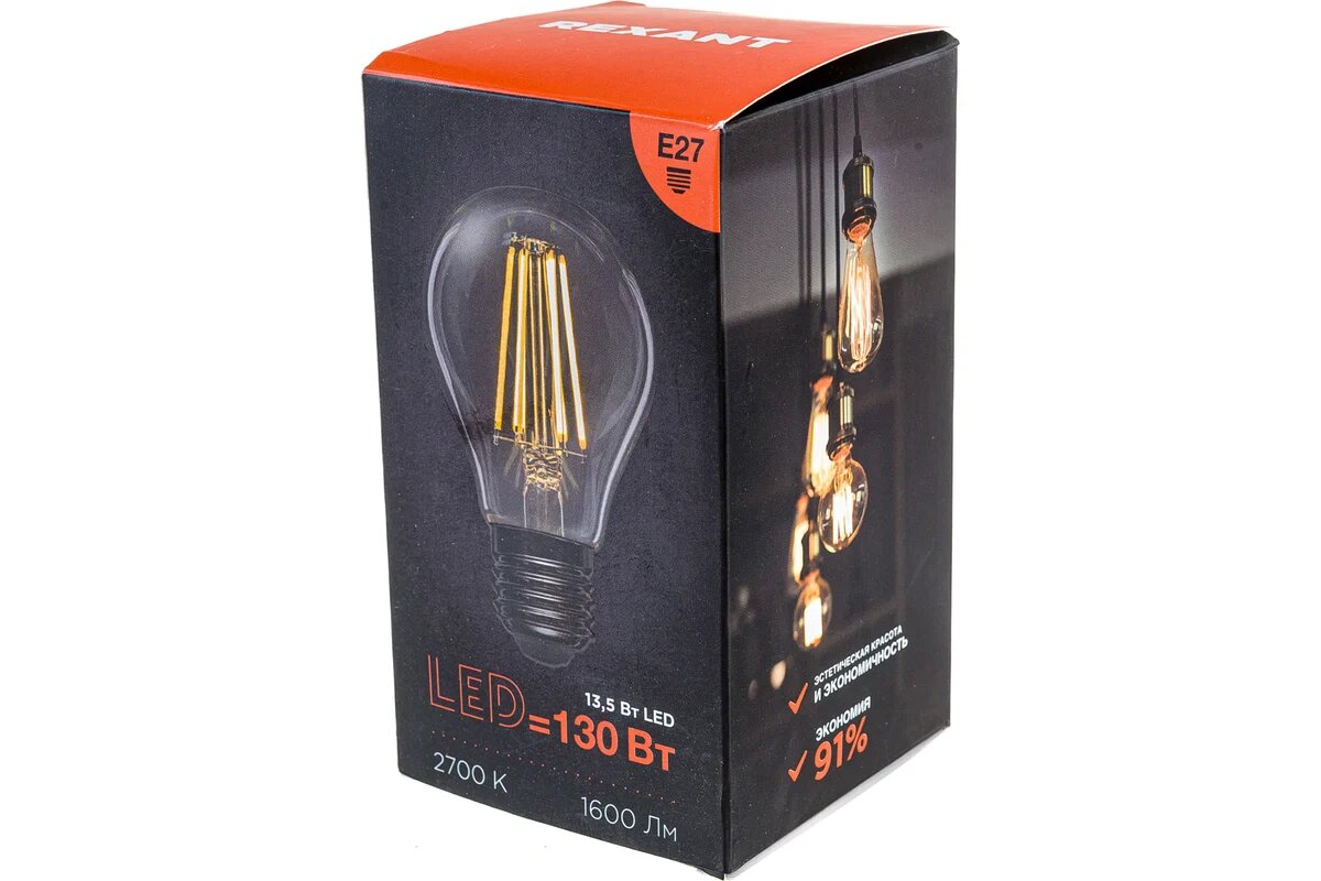 10 цен на Филаментная лампа REXANT Груша A60 13.5 Вт 2700K E27 604-081