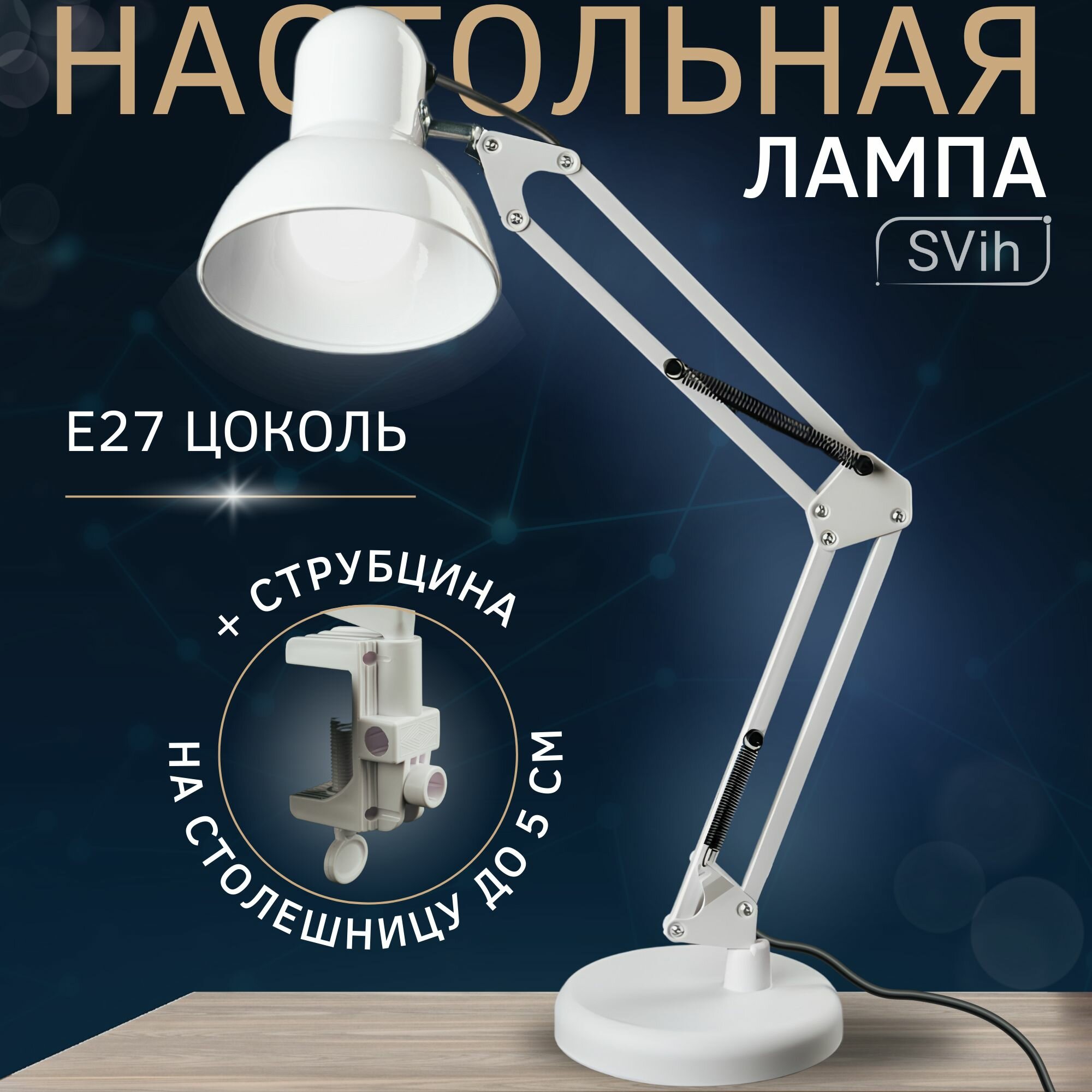 Настольная лампа SVih, E27, LED, поворотный плафон, белый, на струбцине информация: