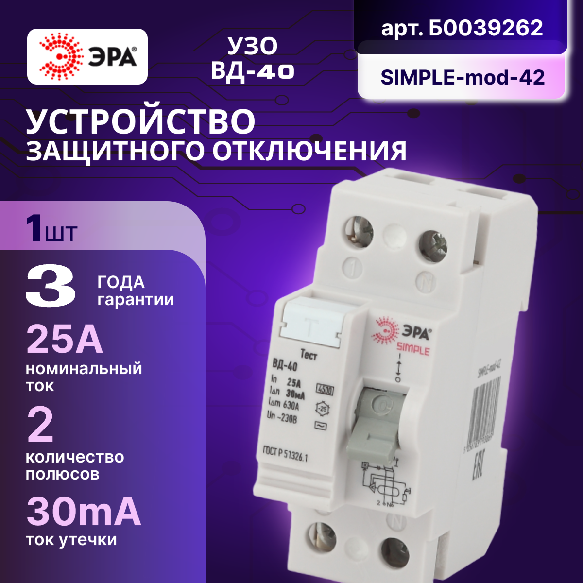 Simple-mod-52 эра simple устройство защитного отключения узо вд-40 2p 63а/300ма (электронное) (100/3, 1шт