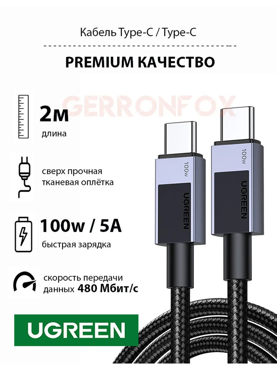 Кабель Ugreen US316 70429 USB Type-C - USB Type-C (2 м, черный)