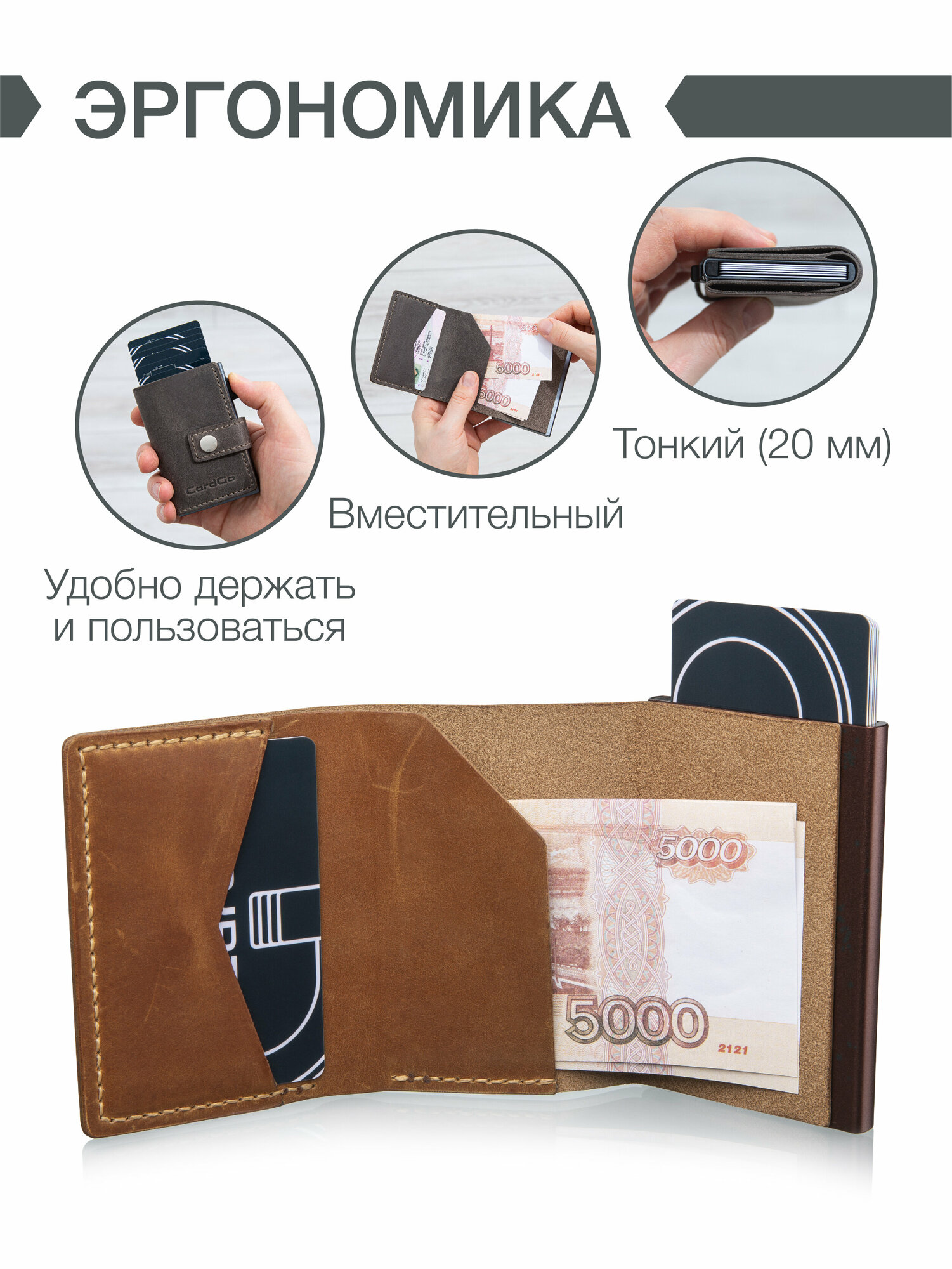 Мини-кошелек CardGo из натуральной кожи со встроенным алюминиевым корпусом (RFID / NFC защита) черный матовый 3 400 ₽