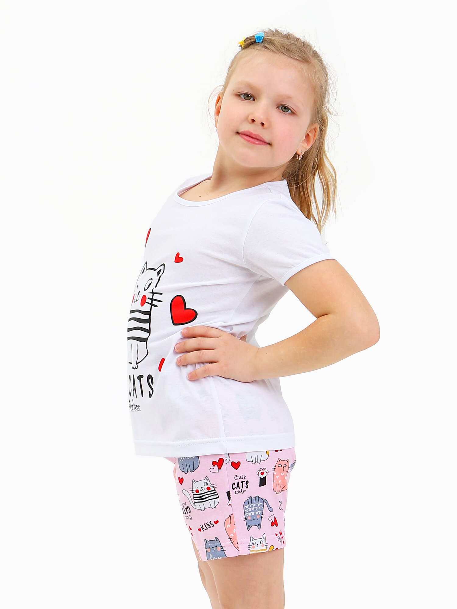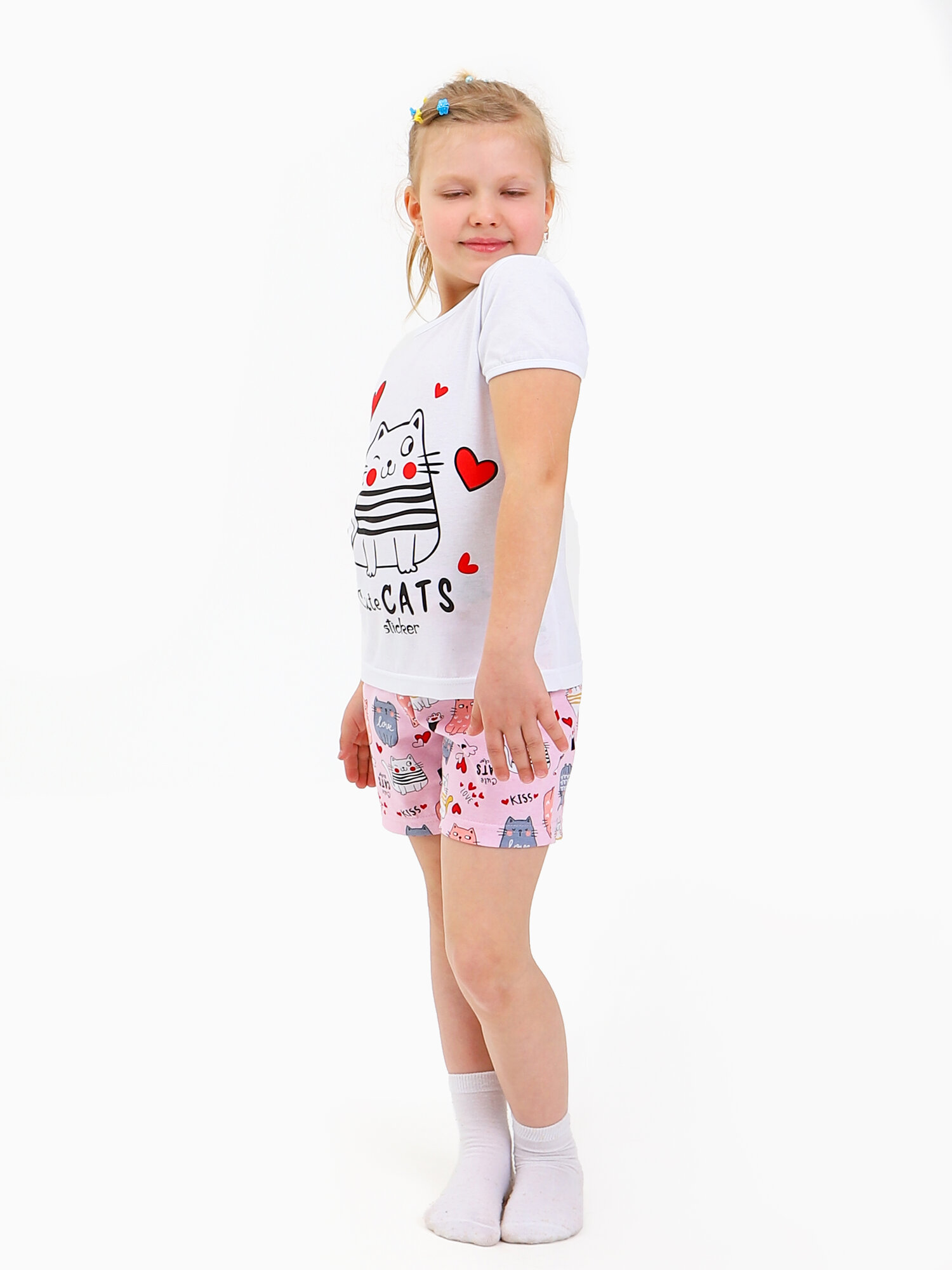 Пижама для девочек, футболка с шортами, Модняшечки, белая/ розовая, мурлыка, размер 122- 68 580 ₽