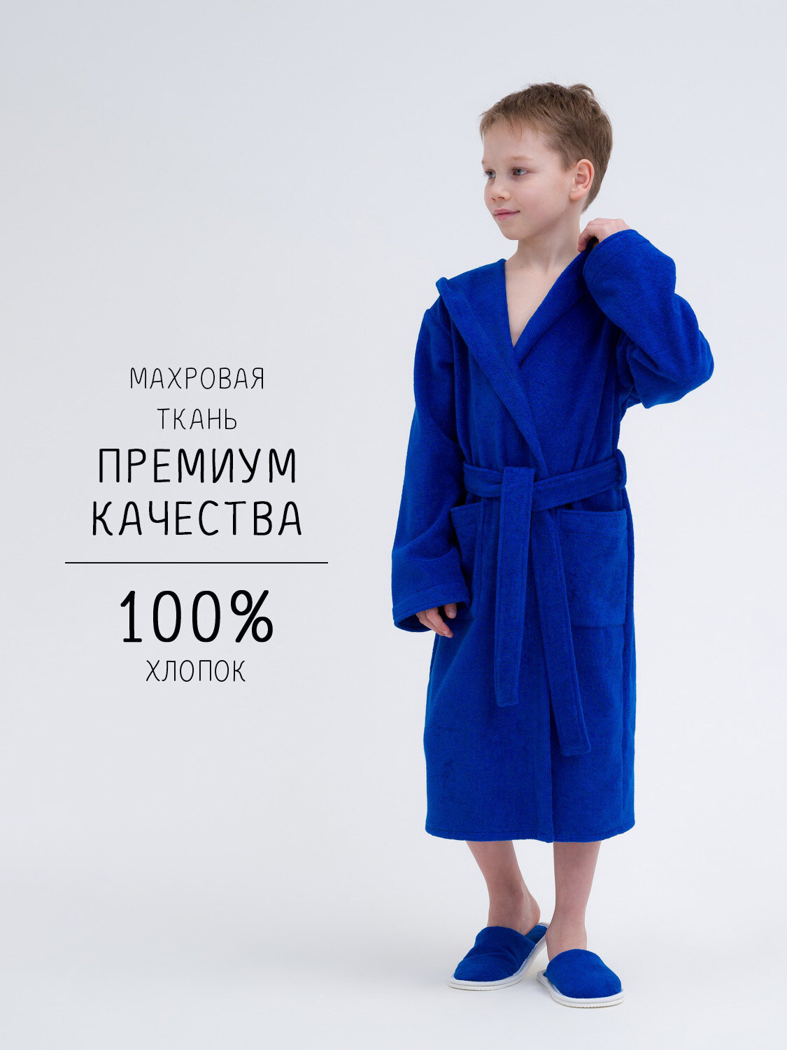 Детский махровый халат с капюшоном Росхалат, синий. Размер 34-36
