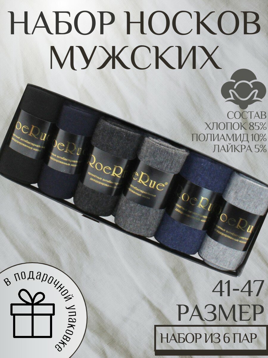 Мужские носки RoeRue, 6 пар, классические, ароматизированные, износостойкие, подарочная упаковка, быстросохнущие, антибактериальные свойства, воздухопроницаемые, на Новый год, на 23 февраля, размер 41-47, черный