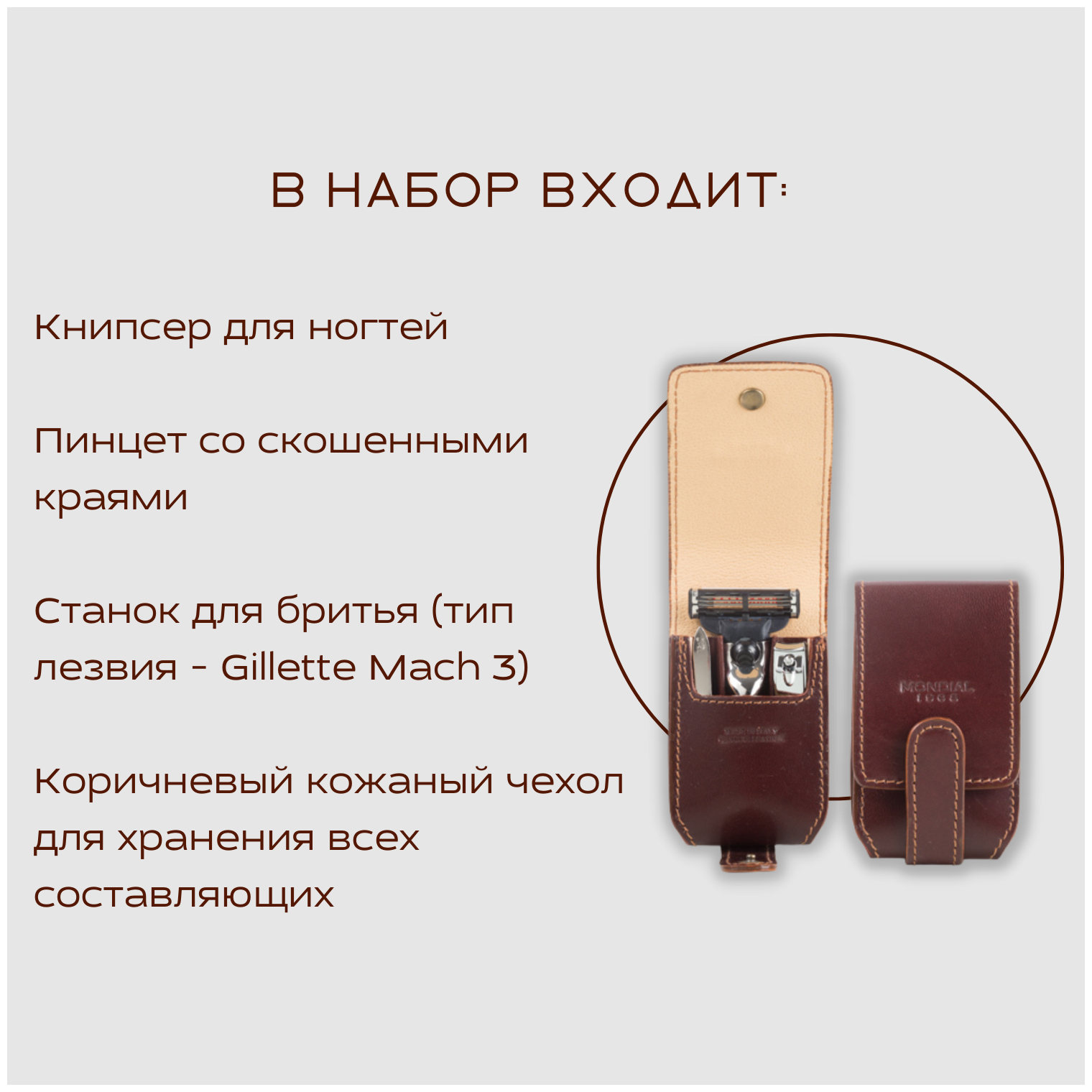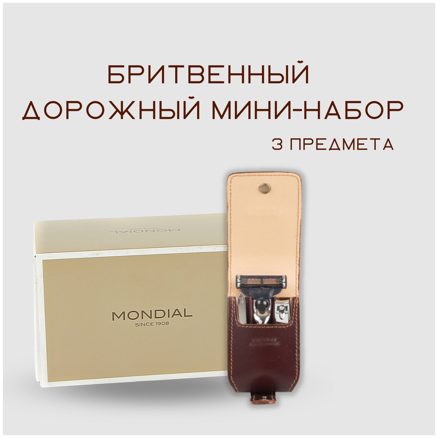 Бритвенный дорожный мини-набор MONDIAL в кожаном чехле: станок с лезвием MACH3, пинцет, книпсер; коричневый SV-075-MIN-M