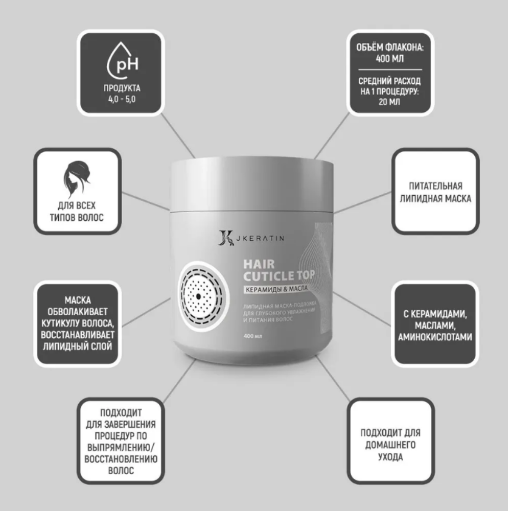 Липидная маска JKeratin Hair Cuticle Top профессиональная, для восстановления волос, 400 мл информация: