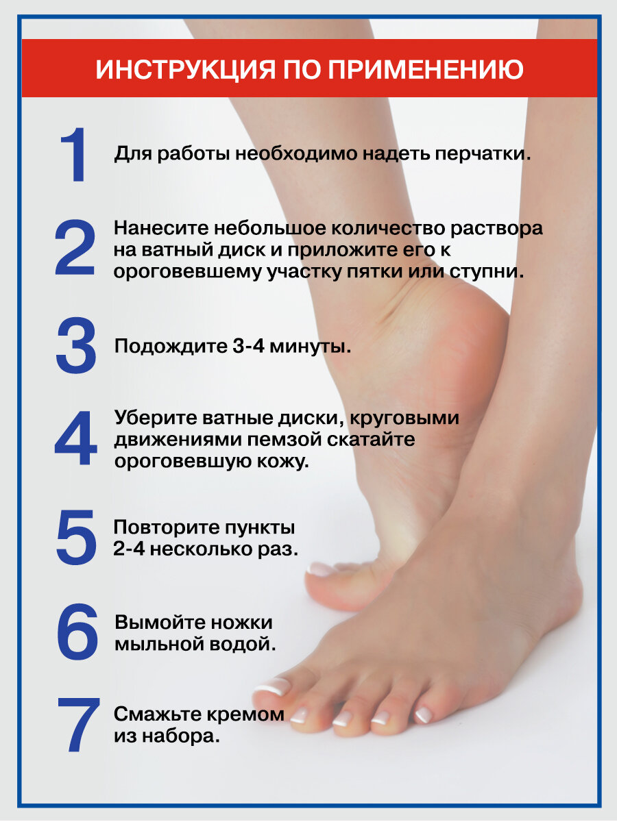 | Способ применения | обильно нанести раствор на ватные диски (лучше разорвать их вдоль, чтоб стали тоньше). Приложить к ороговевшему участку стопы для размягчения кожи. Оставить на 2-3 минуты. Далее обработать размягченную кожу пемзой круговыми движениями. Рекомендуется повторить размягчение и обработку кожи 3-4 раза подряд до достижения желаемого результата (возможно меньшее количество повторений). По окончании обработки тщательно вымыть ноги в мыльной воде, смазать увлажняющим кремом |
