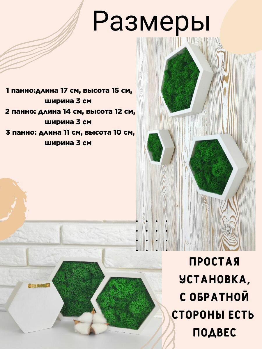 Набор панно 3 шт. из стабилизированного мха "Соты" / картина из мха / искусственные растения информация: