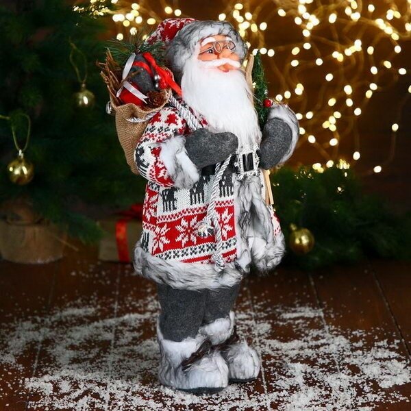 Дед Мороз "В бело-красной шубке с ремешком, с лыжами" 45 см