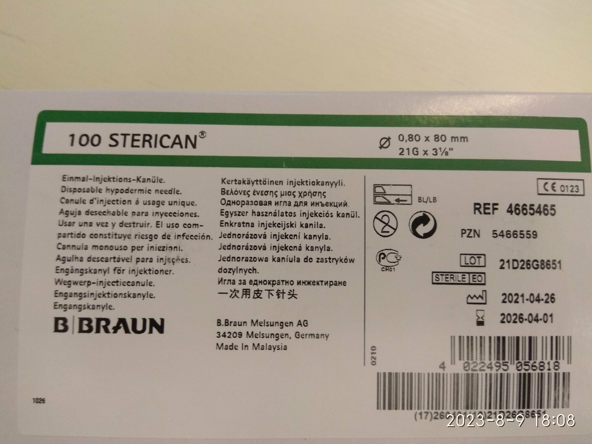 Игла инъекционная B. Braun Sterican 21G (0,8 X 80) упаковка 100шт информация: