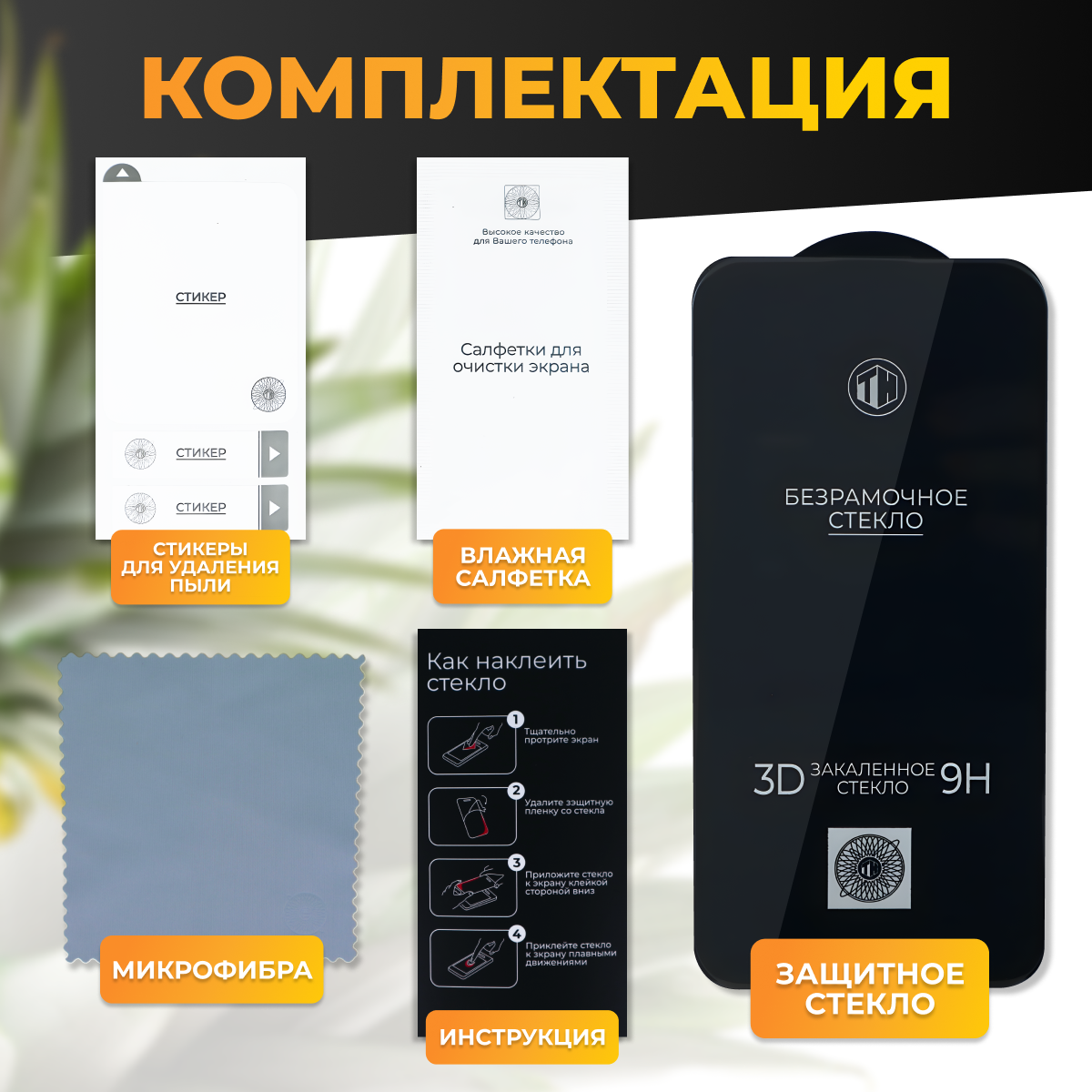 | Подробная комплектация | В комплект входит: защитное стекло, стикеры для удаления пыли, влажная салфетка, сухая салфетка. |