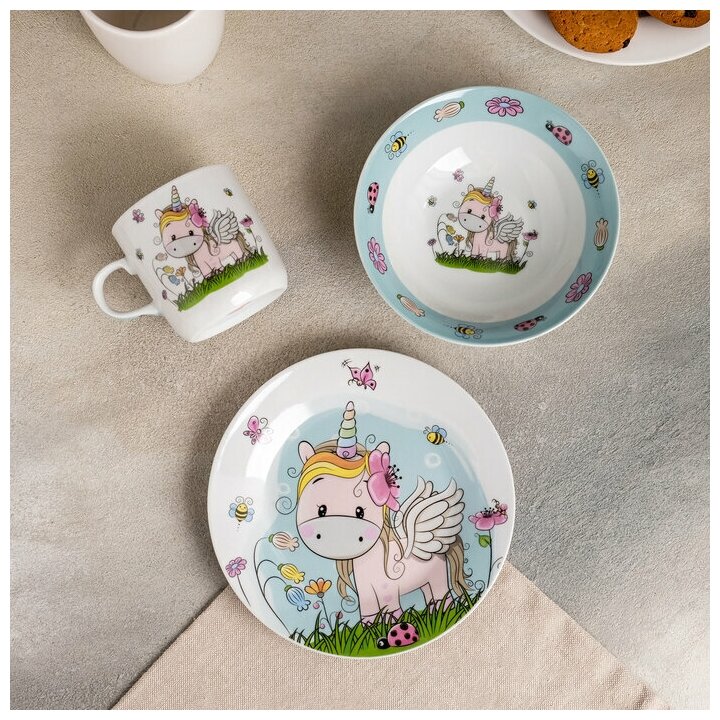 Набор детской посуды из керамики Доляна «Единорог», 3 предмета: кружка 230 мл, миска 400 мл, тарелка d=18 см