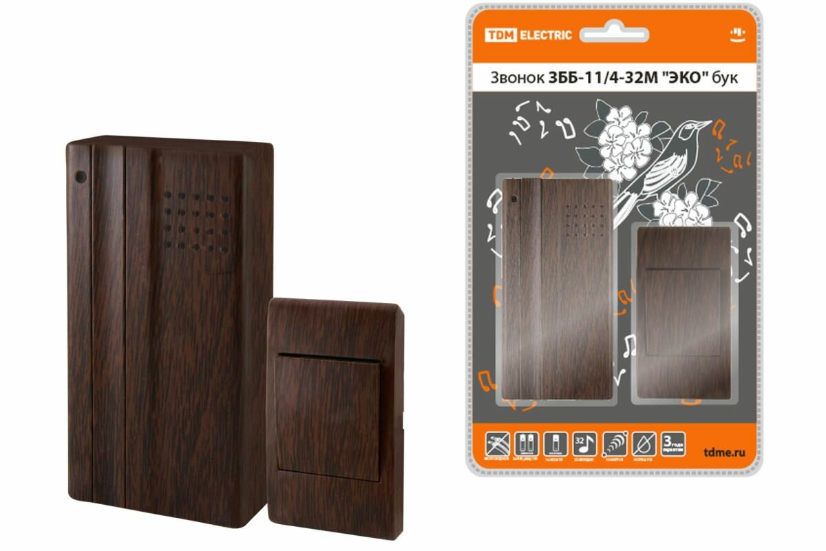Звонок беспроводной на батарейках ЗББ-11/4-32М «ЭКО» бук (32 мелодии, кнопка IP30, 2х1,5В ААА) TDM информация: