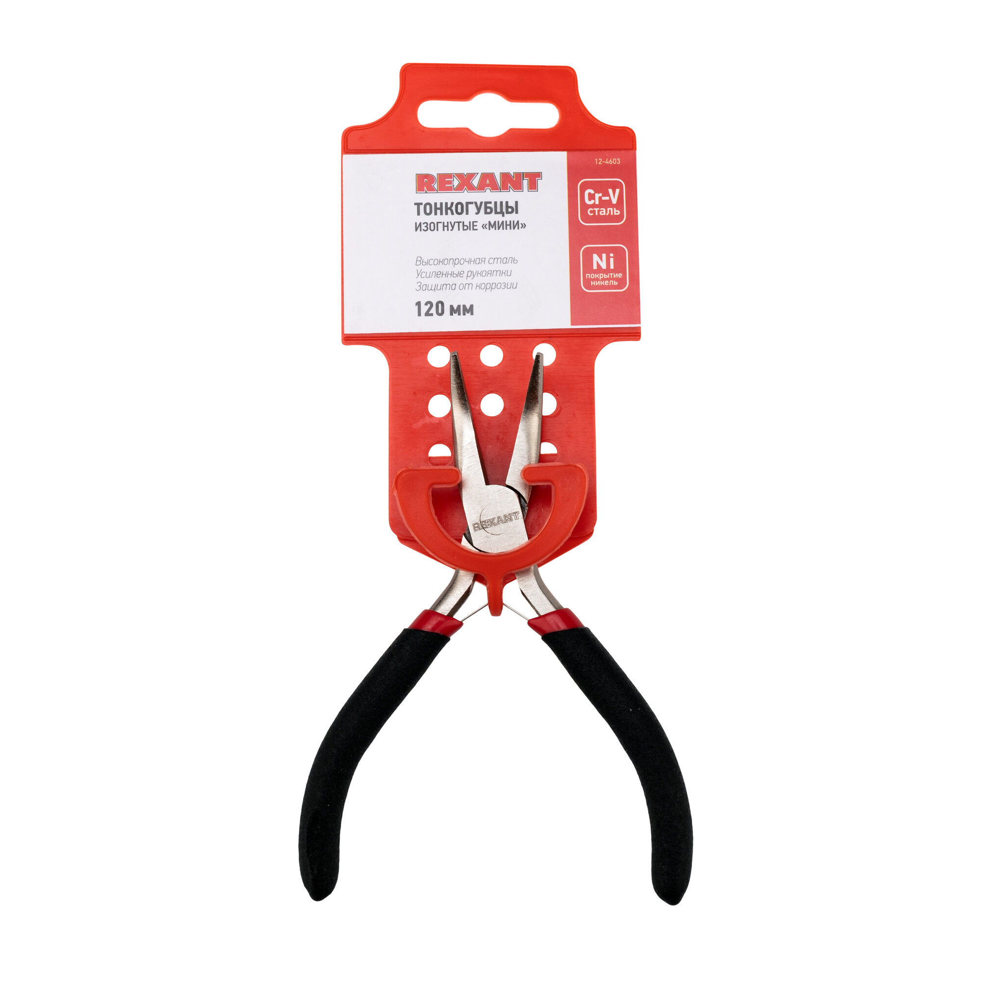 10 цен на Никелированные изогнутые мини-тонкогубцы с авторазжимом губок и обливными рукоятками 120 мм REXANT