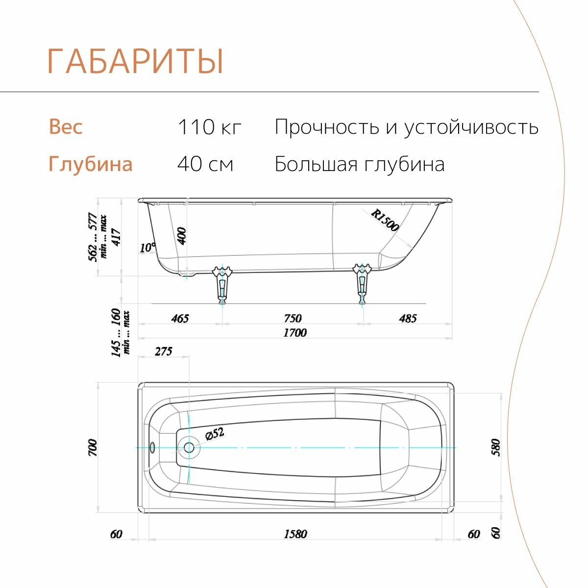 Чугунная ванна tempra Ever 170x70 см белая, глянцевая, с ножками информация: