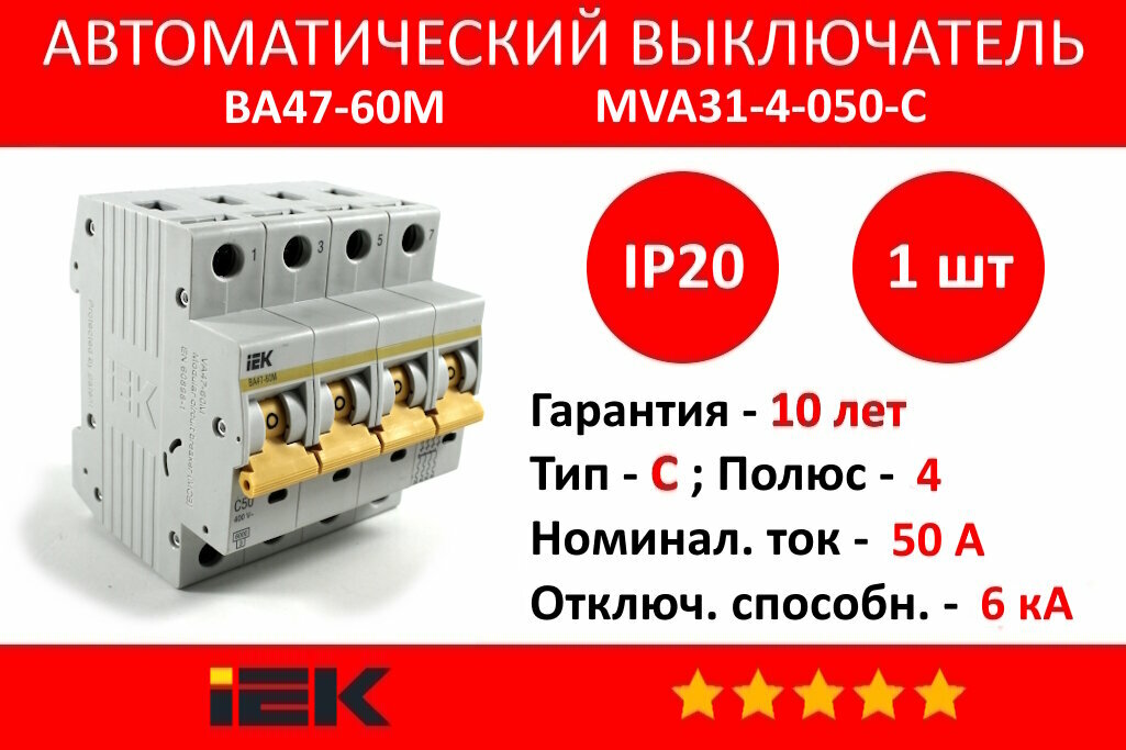 Отзывы на Автоматический выключатель ВА47-60M 4Р, 50А, 6кА, С IEK MVA31-4-050-C (1 шт.)
