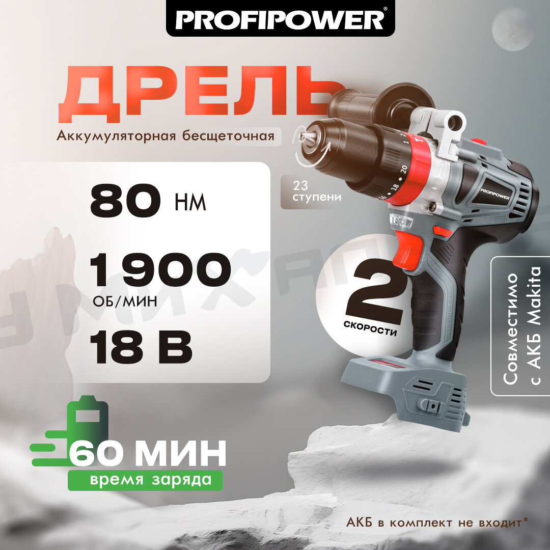 Отзывы на Аккумуляторная дрель бесщеточная ударная ProfiPower MKDHP-18V, без акб,18В, 80Нм, 2 скорости, магнитная бита, рукоятка, в коробке