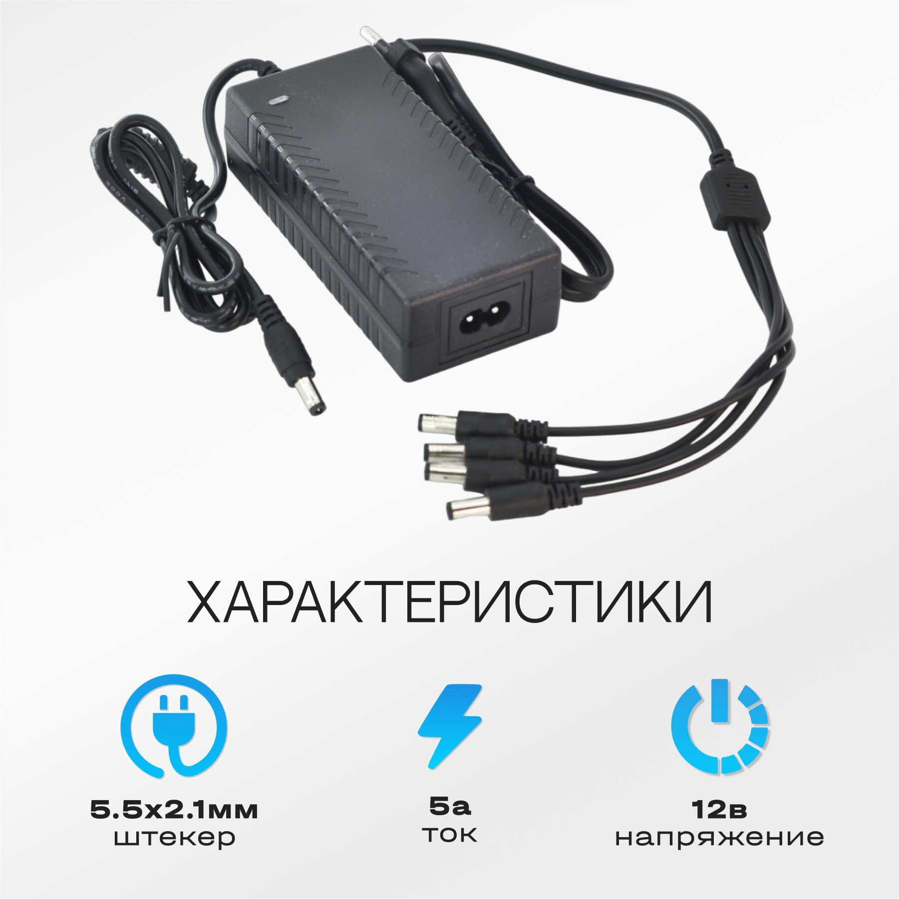 Блок питания для камер видеонаблюдения 12В 5A с разветвителем на 4 камеры (5.5x2.5мм) информация: