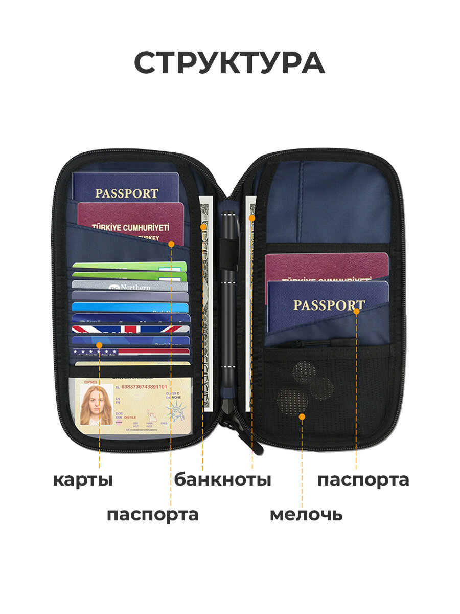 | Дополнительная информация | Дорожный кошелек, дорожный органайзер для документов, документница - удобный полезный аксессуар для поездок и путешествий. |