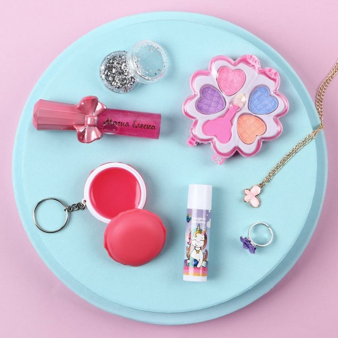 Набор детской косметики "Будь стильной", тени, блеск для губ, бальзам для губ, глиттер, кольцо, подвеска