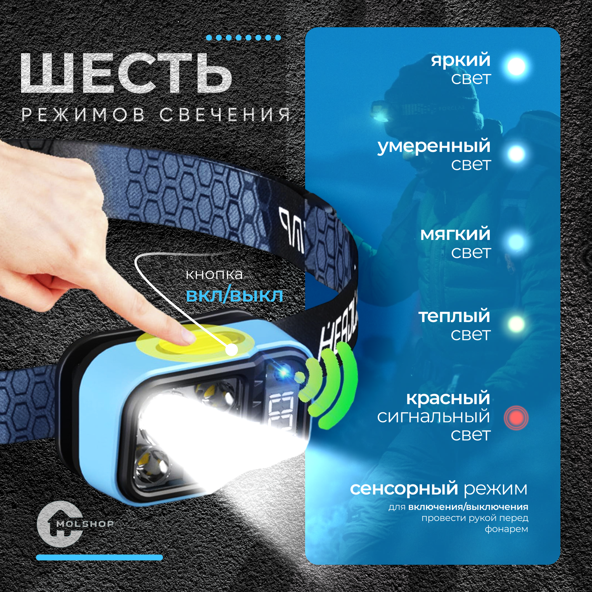 Фонарик налобный голубой/Фонарь аккумуляторный информация: