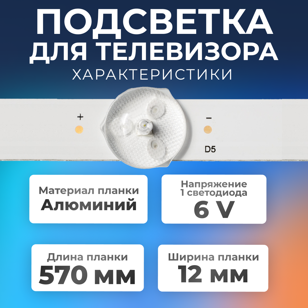 Подсветка для телевизора TCL LED32D3000, L32S6400, DAEWOO L32A645VTE и др / 6V 5 led (комплект 2 шт) 562mm