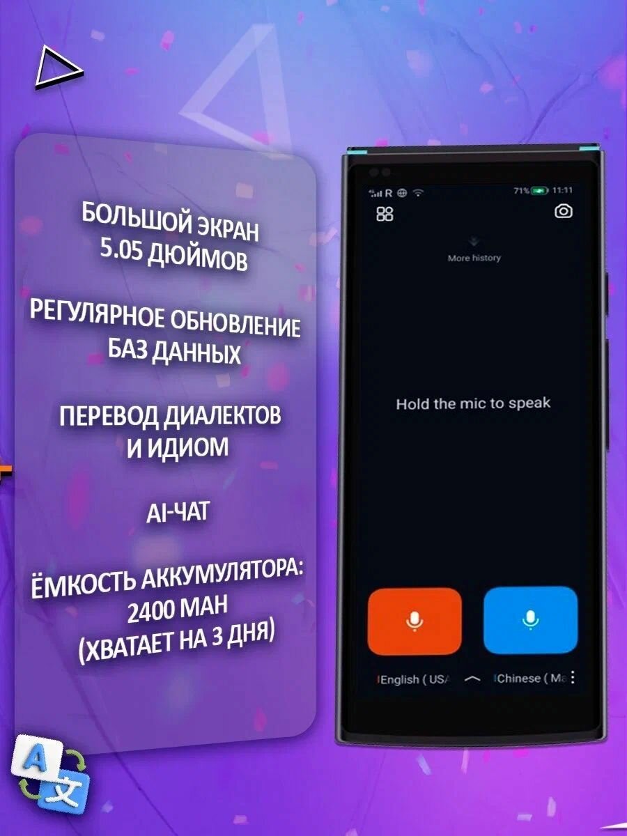 | Комплектация | Переводчик, кабель Type-C, адаптер (DC 5V 3A), защитный чехол, защитная плёнка, инструкция, скрепка |