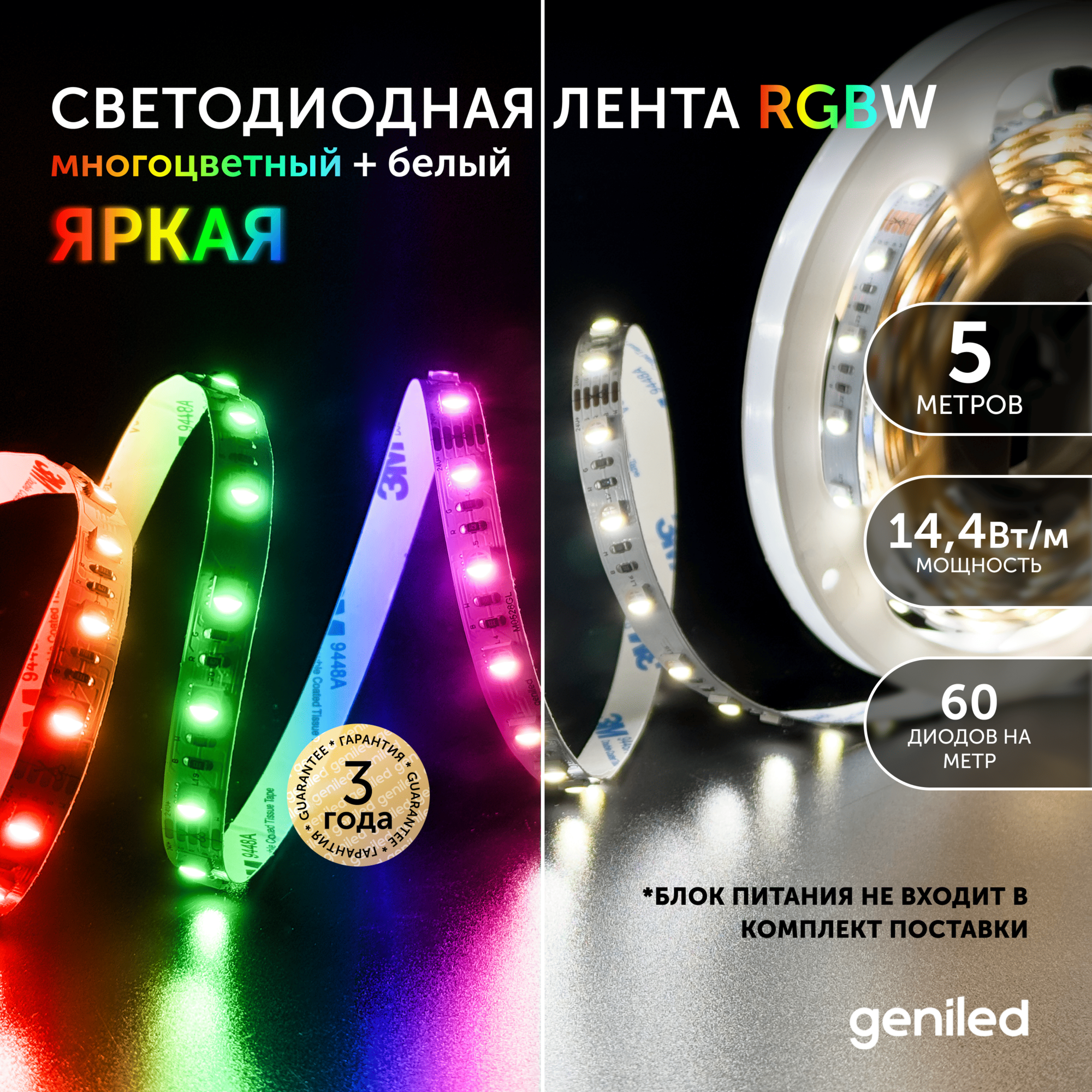 10 цен на Светодиодная лента, подсветка Geniled - для комнаты, в гардероб, на кухню - Цветная+Белый свет (RGBW) GL-60SMD5050 / 24В / Длина - 5м / B - 10 мм / W - 14,4 Вт / 4000 К / IP33