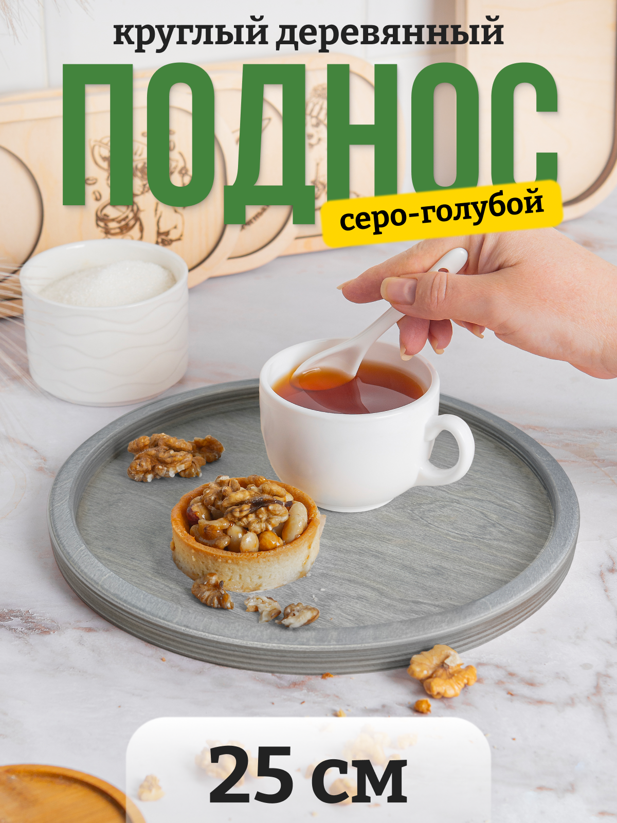 10 цен на Круглый поднос деревянный 25 см - покрытие цвет "Серо-голубой"