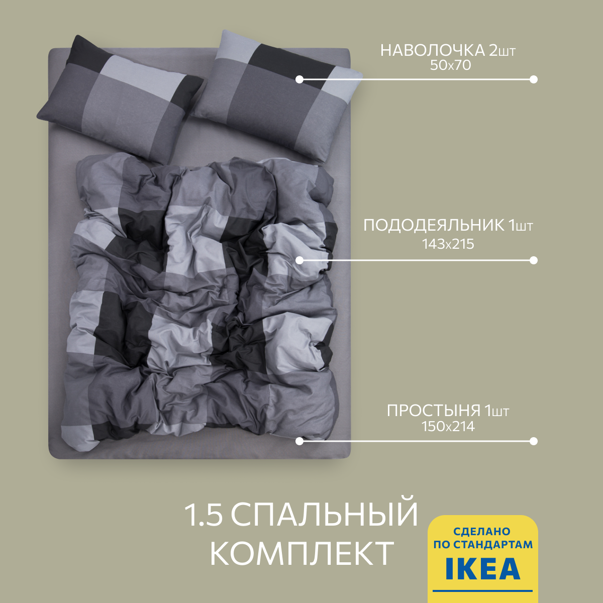 Постельное белье, Бязь, 1.5 спальное, 2 наволочки 50х70, GM, Gray cage 100% хлопок IKEA, информация: