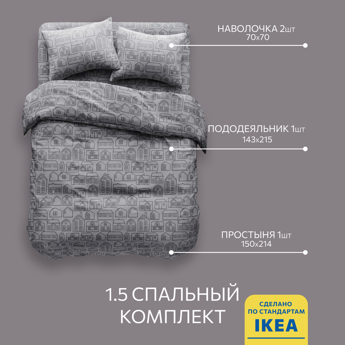 Постельное белье, Бязь, 1.5 спальное, 2 наволочки 50х70, GM, Gray cage 100% хлопок IKEA, 1 827 ₽