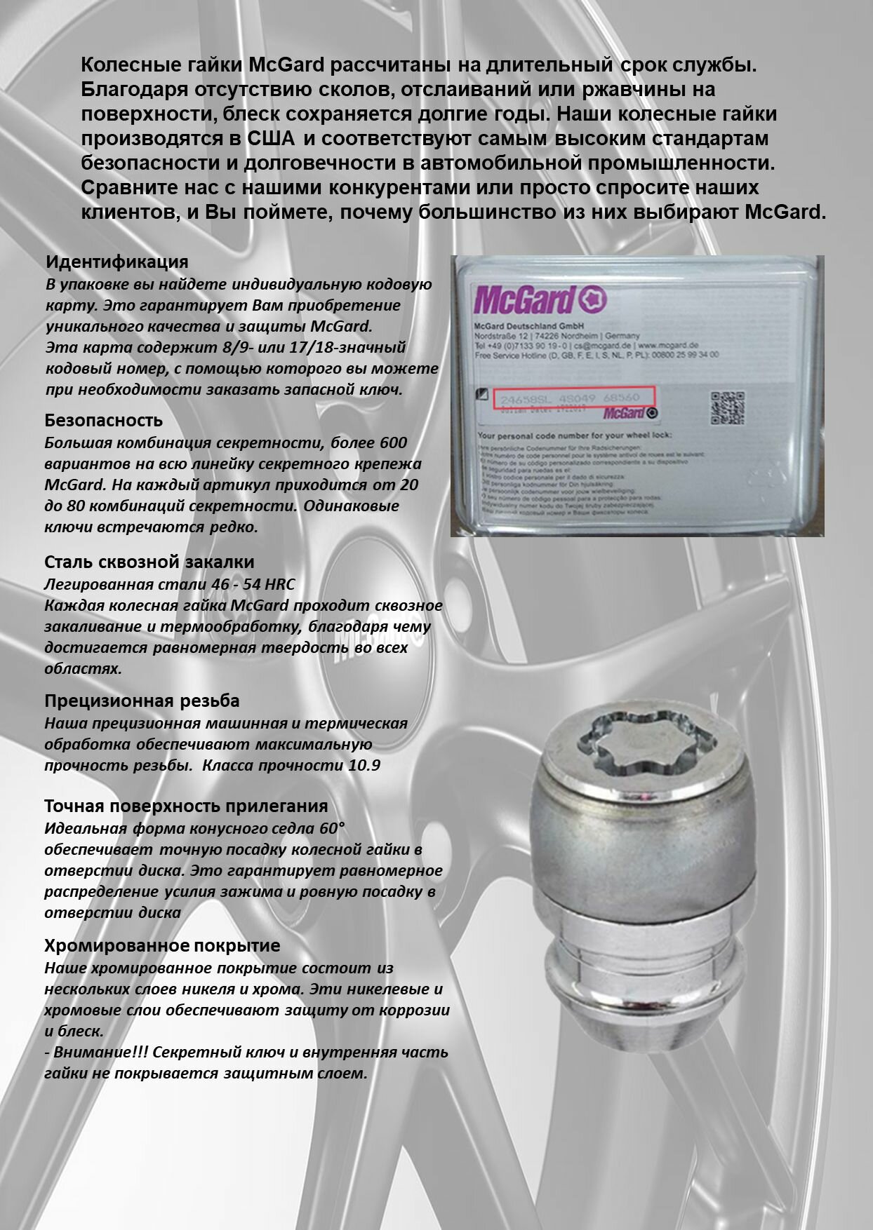 10 цен на Гайки-секретки McGard 24195SL для Hyundai, Kia, Mazda M12x1.5 L35mm S21mm, конус, усиленные, 4 гайки 1ключ
