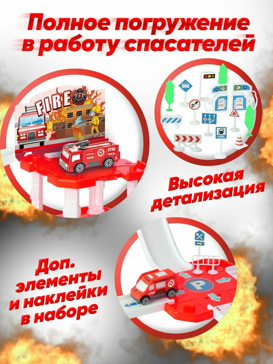 Парковка для машинок многоуровневая Play Okay Parking Fire, гараж детский с горкой и наклейками + дорожные знаки, Конструктор для мальчиков (игровой набор пожарной техники Паркинг) / 63 детали информация: