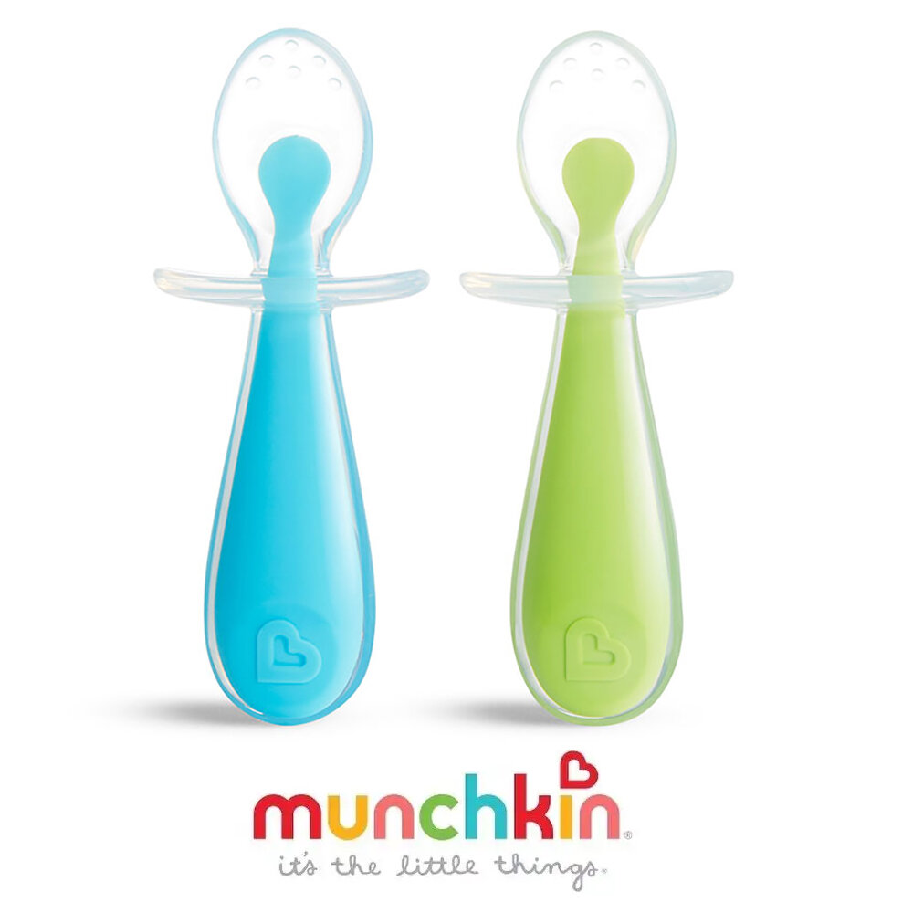 Отзывы на Набор ложек обучающих Munchkin Gentle Scoop, пластик/силикон, с ограничителем, голубой/зеленый, 2 шт
