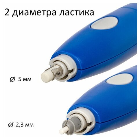 | Дополнительная информация | не оставляет бумажной пыли; 8 ластиков-насадок размером 5х25 мм, 8 ластиков-насадок размером 2,3х25 мм и два пластиковых держателя для них; работает от 2 батареек ААА (в комплект не входят); корпус пластиковый |