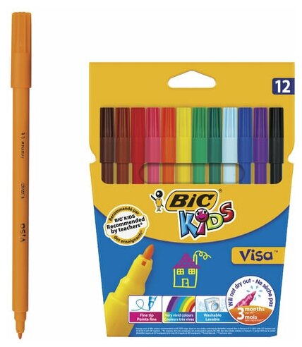 Фломастеры BIC "Kids Visa", 12 цветов, суперсмываемые, вентилируемый колпачок, европодвес, 889695, 888695