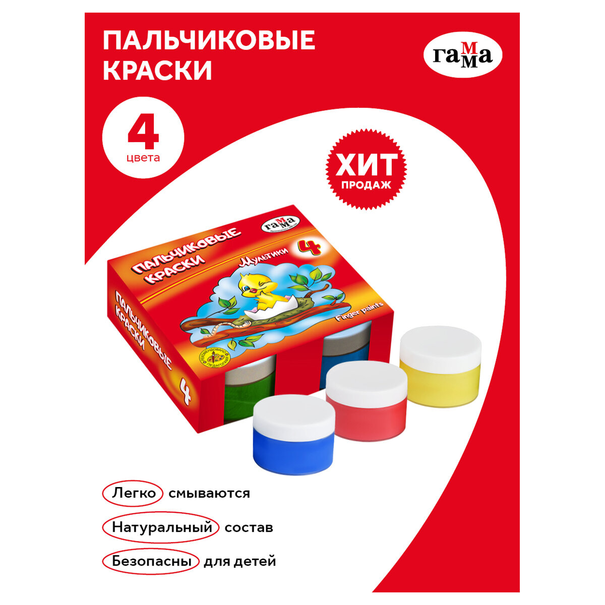 | Комплектация | Краски для рисования Гамма, Мультики, детские, пальчиковые, 4 цвета по 50 мл, 1 уп |