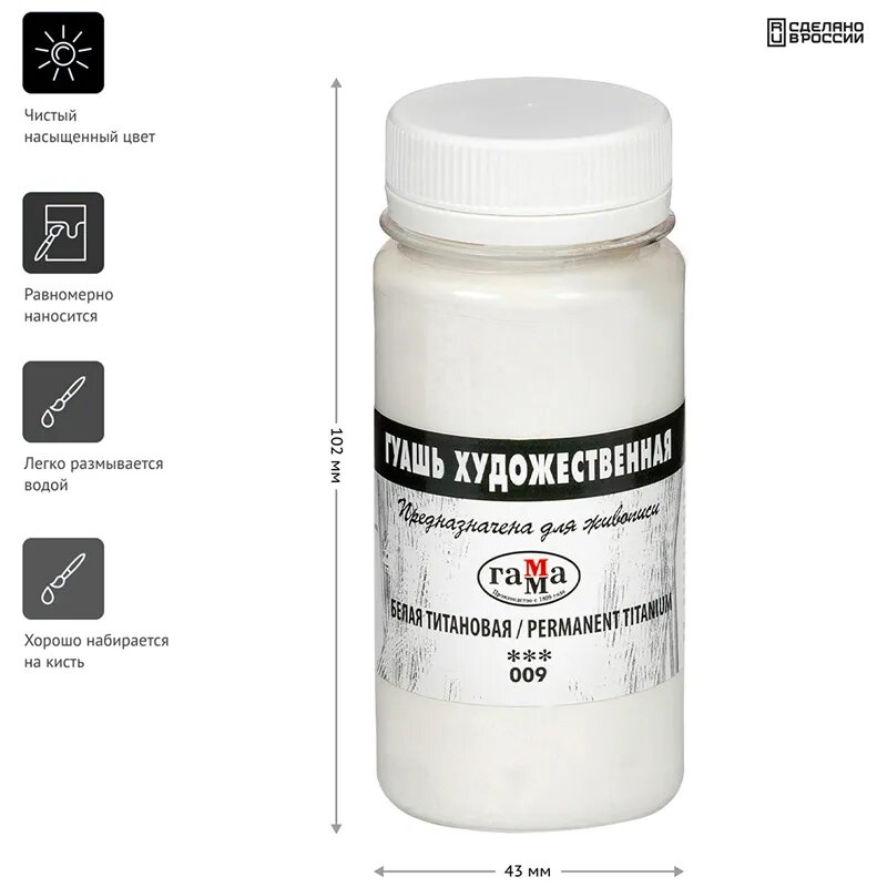 Гуашь художественная Гамма, белая титановая, 110 мл, цвет 009 информация: