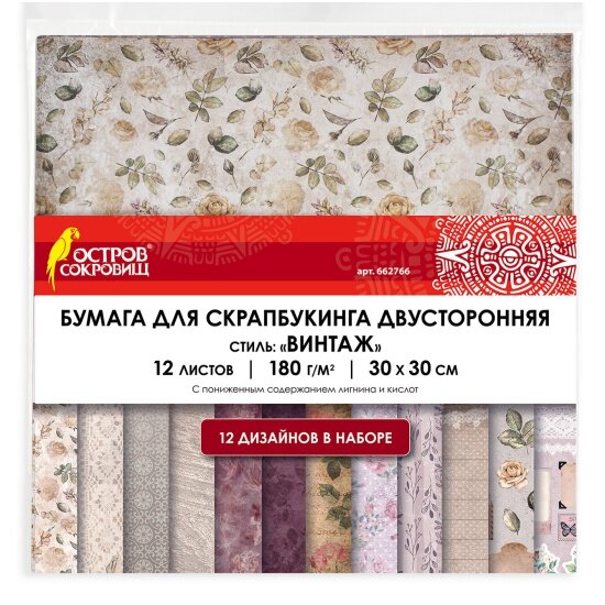 Бумага для скрапбукинга Остров Сокровищ 30х30 см "Винтаж", двусторонняя, 12 листов, 12 дизайнов, 180 г/м2, информация: