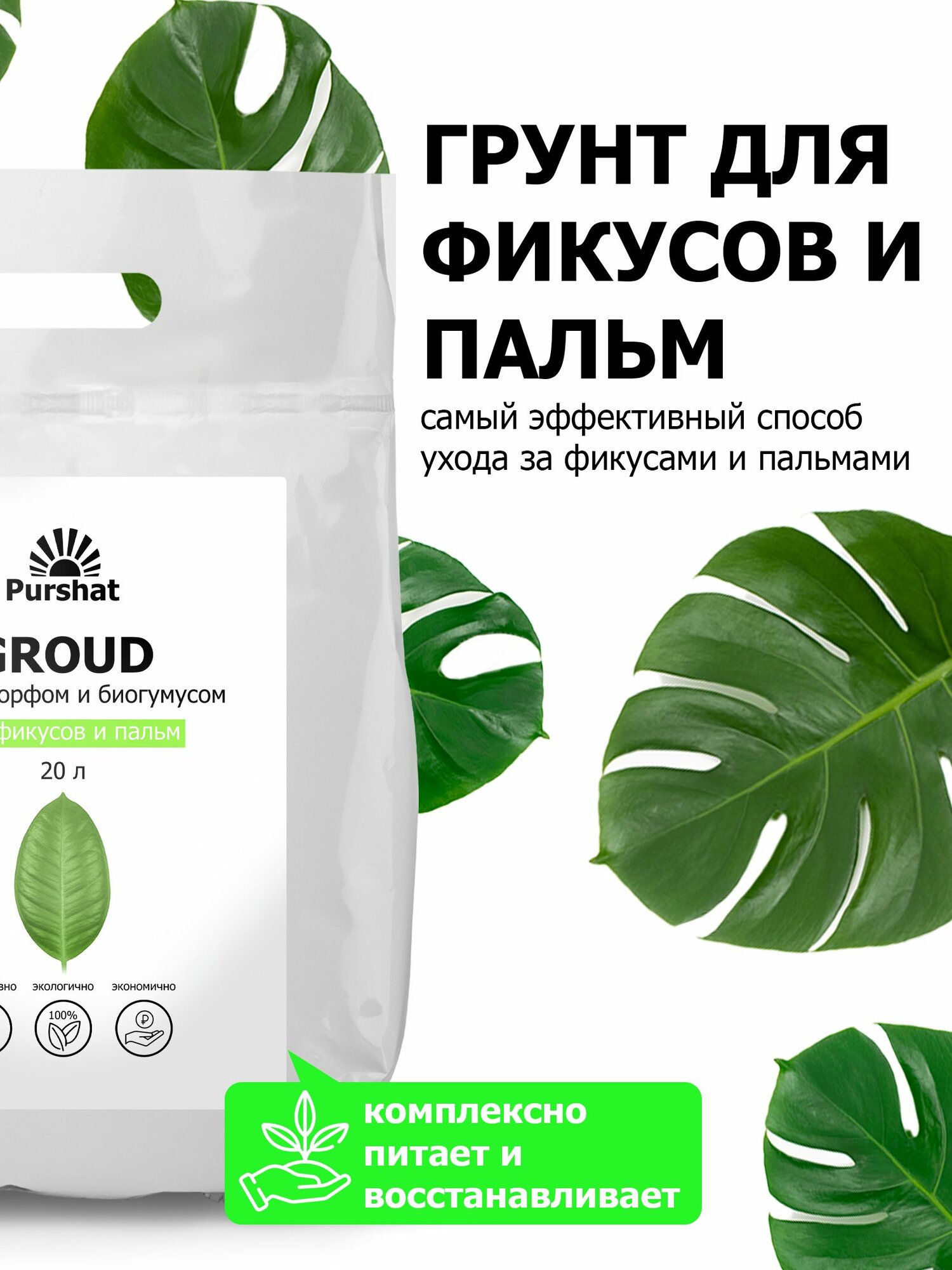 Грунт для фикусов, пальм, монстеры и драцены Пуршат 20 л — питательный, для активного роста информация: