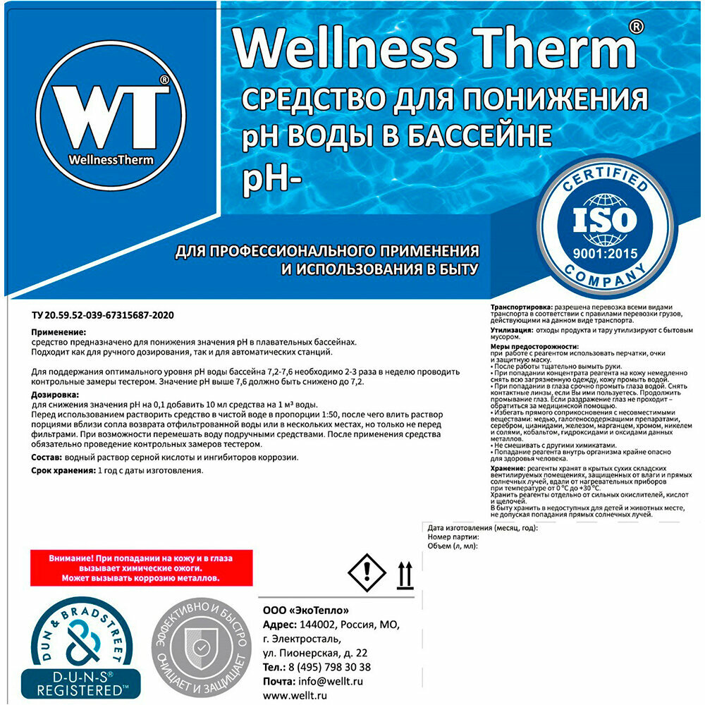 Средство «Wellness Therm» для понижения PH воды в бассейне (PH -) 10 литров информация: