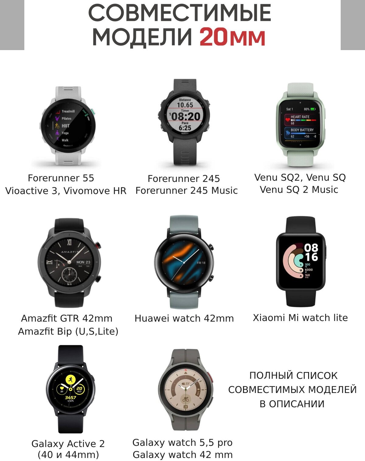 | Совместимые модели умных часов | Garmin Forerunner 245, Garmin Forerunner 245 music, Garmin Forerunner 55, Garmin Forerunner 645, Garmin Venu, Garmin Venu Sq, Garmin Vivoactive 3, Garmin Vivoactive 3 Music, Huawei Watch 2, Samsung Gear S2, Samsung Gear Sport |